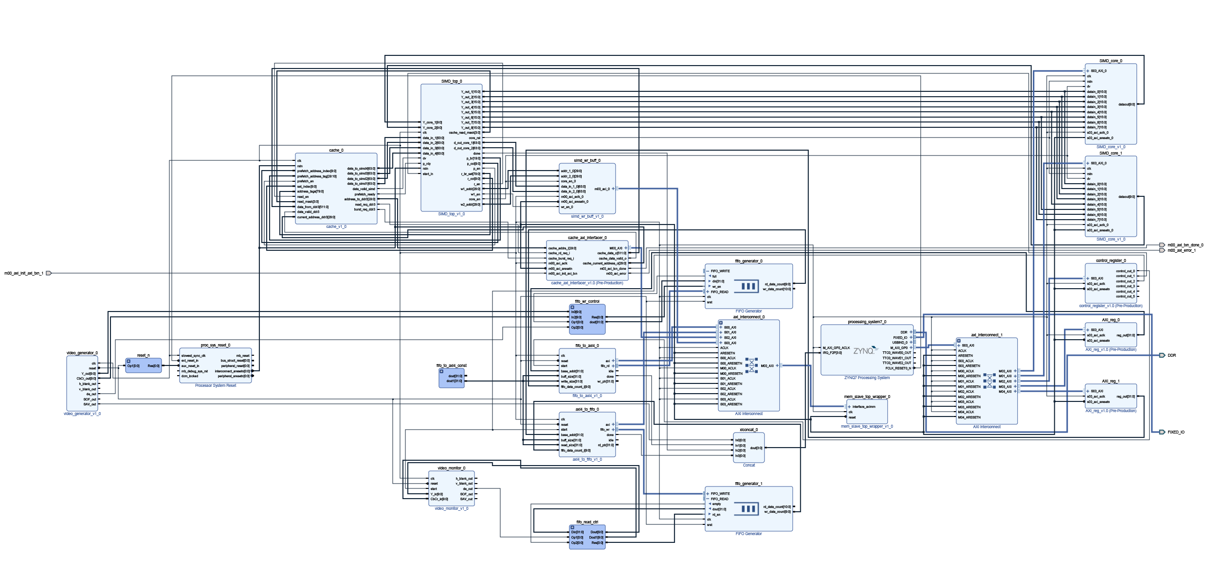 Design an SOC in Vivado to receive a video feed in YUV format (1080p, 30 FPS), write to memory, read it, apply two 7x7 fixed point kernels using a custom cache and a custom SIMD processor, write both outputs to memory and stream them out as two YUV video streams.