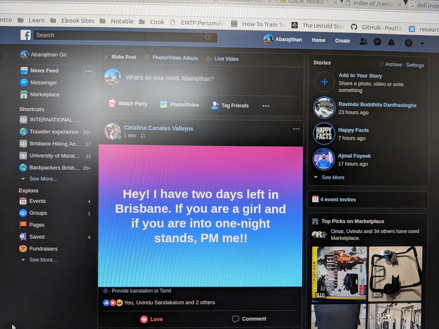 Cata is the coolest girl I met in Australia. She worked with us in Donga (our lab). With two days left for her to return to Chile, we found her PC, unlocked with her Facebook open. Hiran, Samith and I decided to try the classic troll, Uvindu wasn’t in the room. I typed this up from her profile and posted it, disabled notifications and hid it from her timeline.