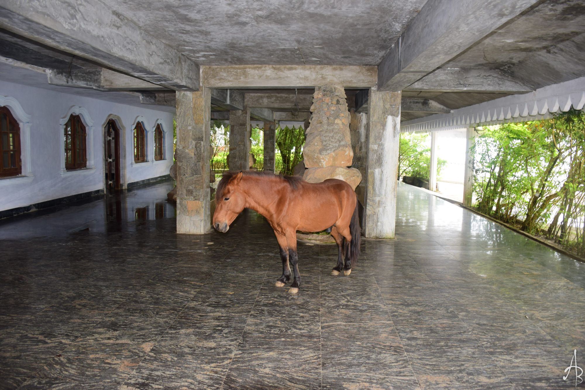 When we finally climbed down and prepared to leave, we encountered this lonely horse, standing calmly and quietly in a hall. With the photographer’s spirit rising within me, I took a couple of shots of the horse and told Dhanushan: