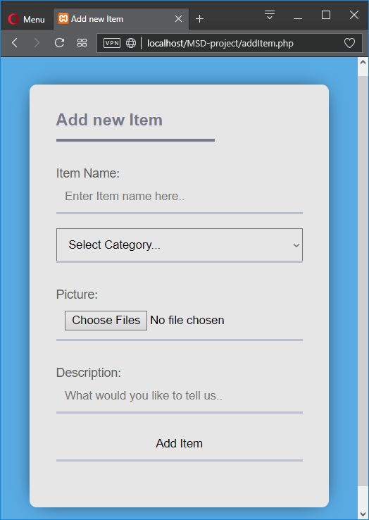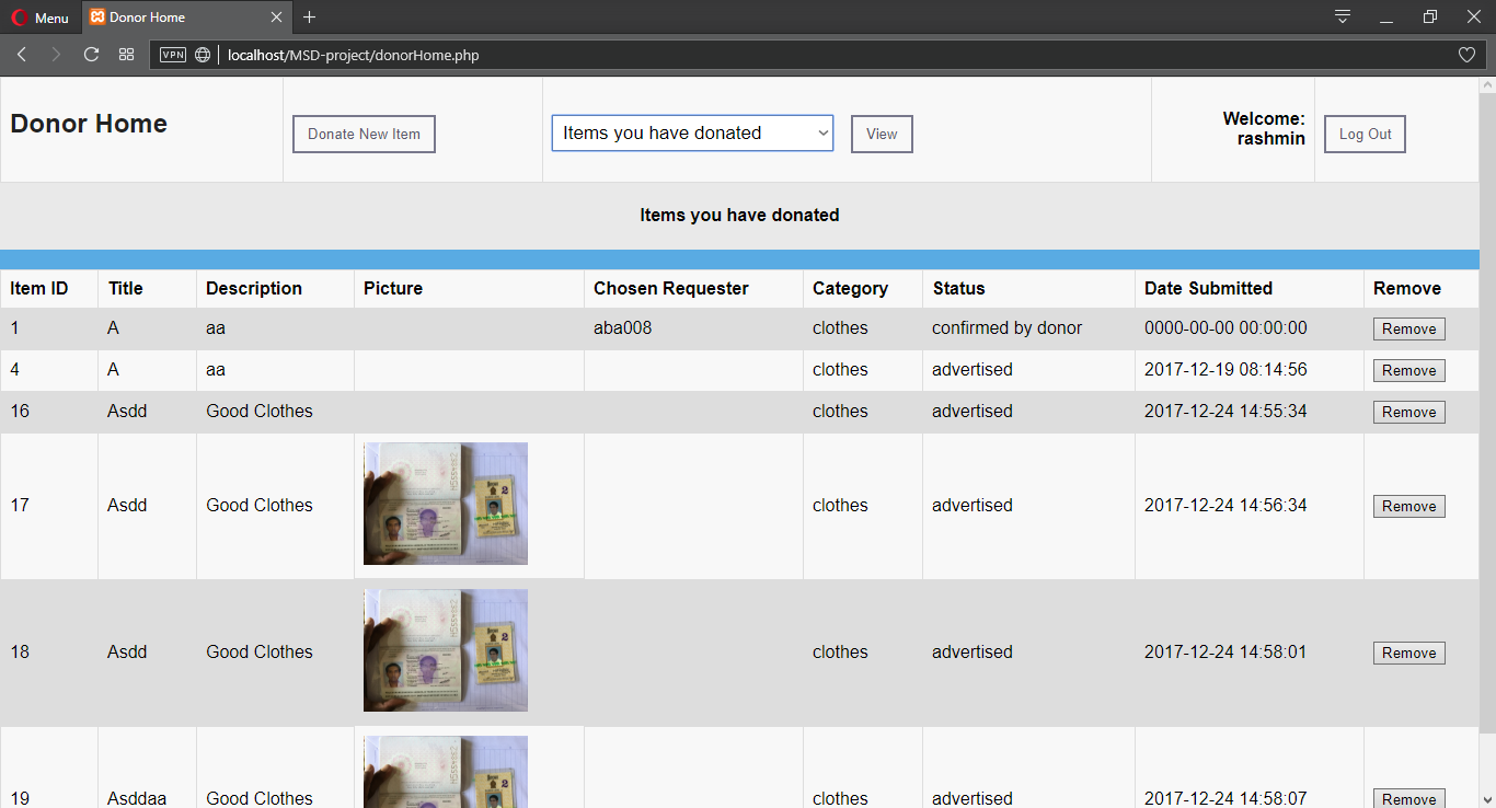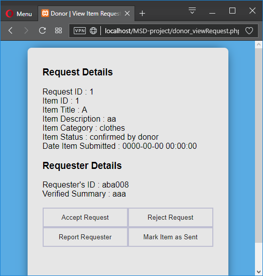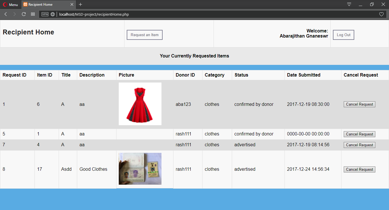 A donor can place information about his/her item in the system. A recipient can find items through a search feature and request up to five items. Multiple recipients can request one item. A donor can view all the items he/she has donated and the requests that have arrived at his/her items. By considering the summary of each recipient, the donor confirms one request out of many, per item. This marks the item as ‘confirmed by donor’