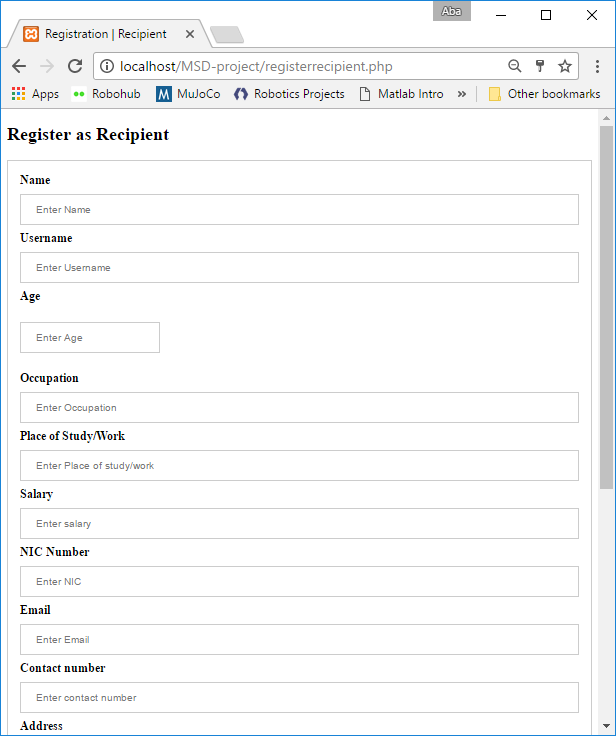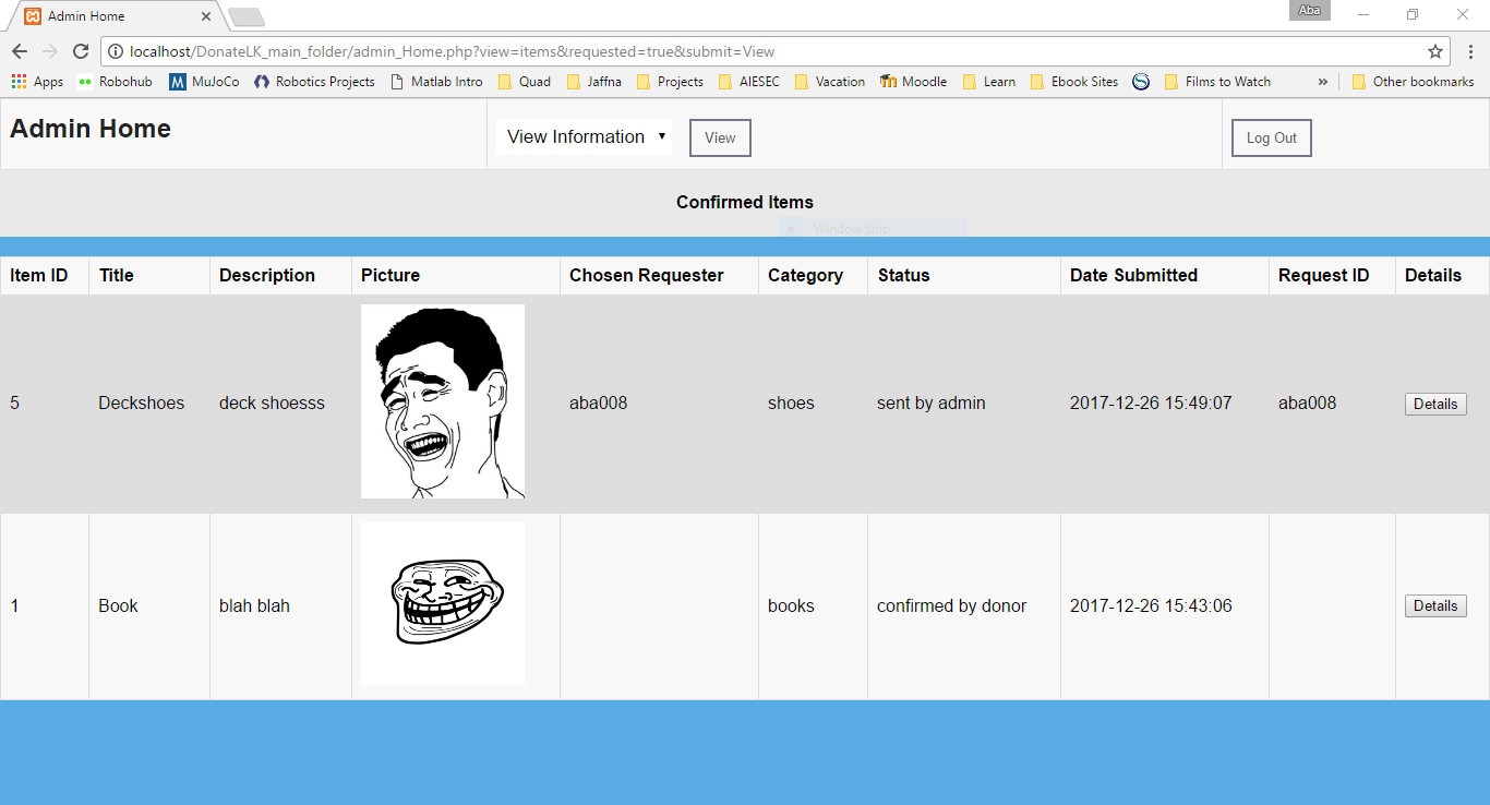 Items sent by donors are shown to the admin in the admin’s database. The admin then receives the item and marks it as ‘received by admin’. Then he/she sends it to the recipient, marking the item as ‘sent by admin’. The recipient can track the status of the item through the recipient home page. When the recipient receives the item, he/she marks it as ‘received by recipient’ and that ends a transaction.