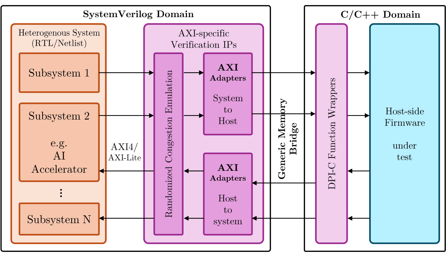 I built an SV + C harness that behaves in simulation as an AXI Interconnect + CPU. The C firmware is compiled and executed in the host machine (x86). The register writes & reads are mapped to SV tasks that drive the AXI slave interfaces. The AXI master ports of the subsystem read/write from the host machine’s DDR through C functions.