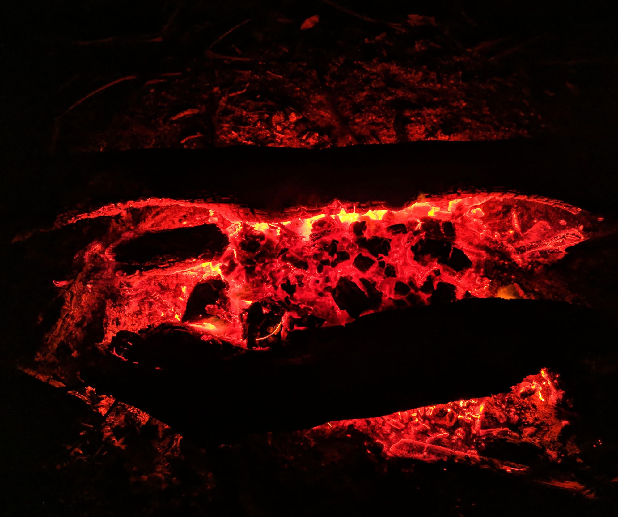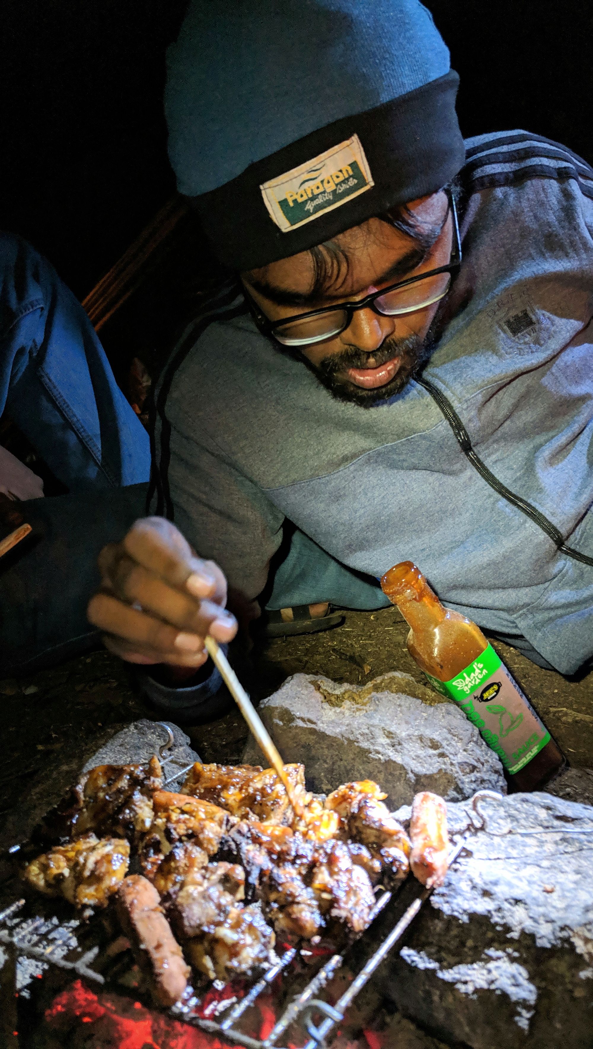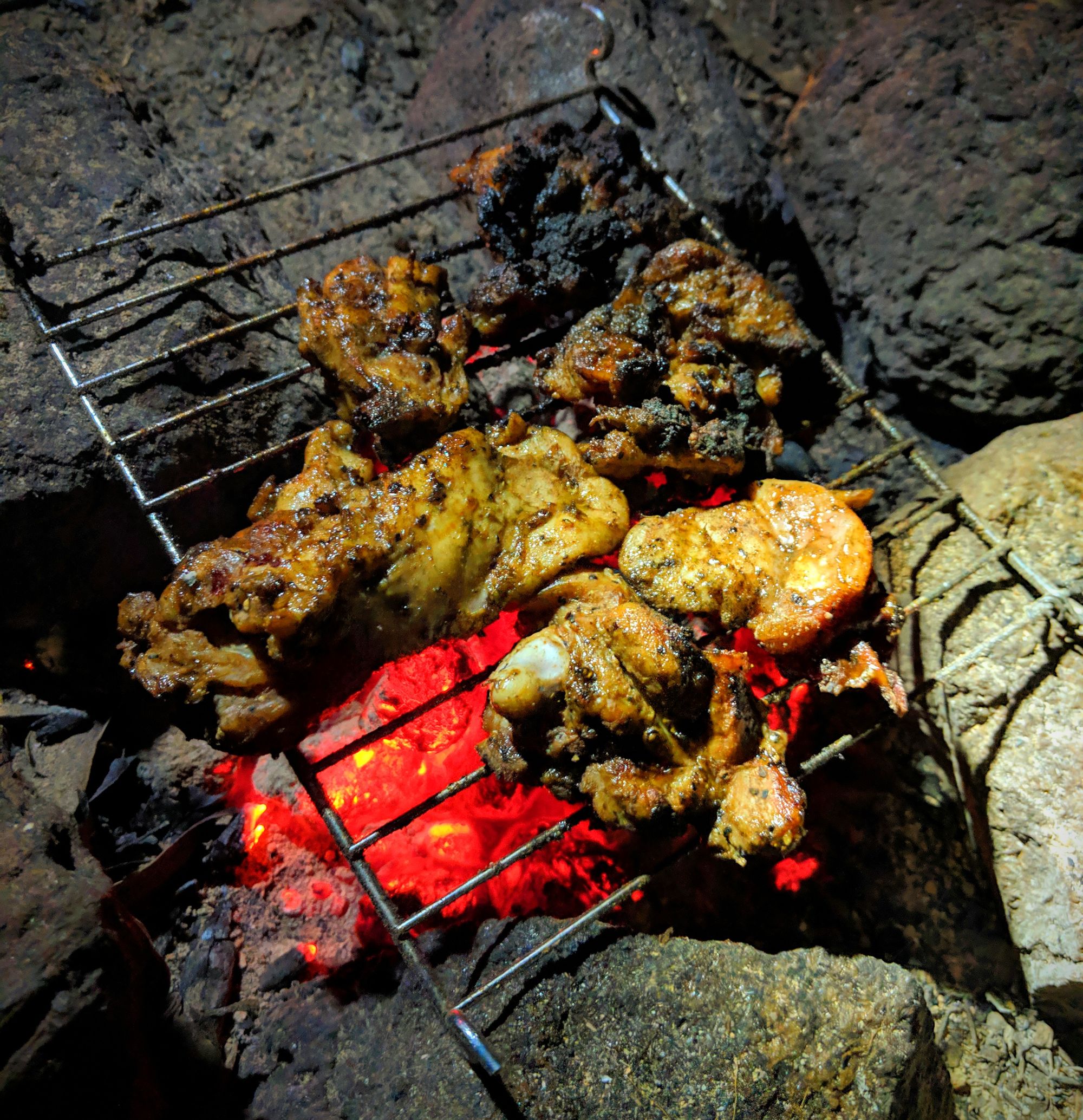 Cooking chicken on a makeshift grill. Red light (last) to accustom our eyes to see the stars