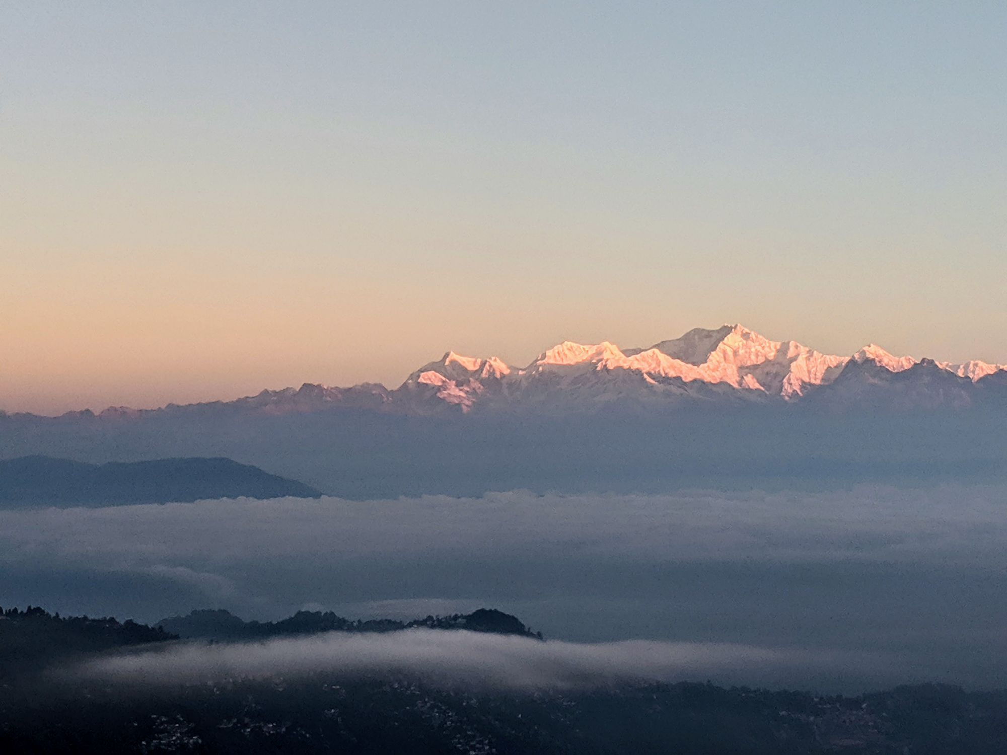 Sunrise from Tiger Hill over Kanchenjunga. Everest can be seen on the left side as the smaller peak among the two tiny white peaks.