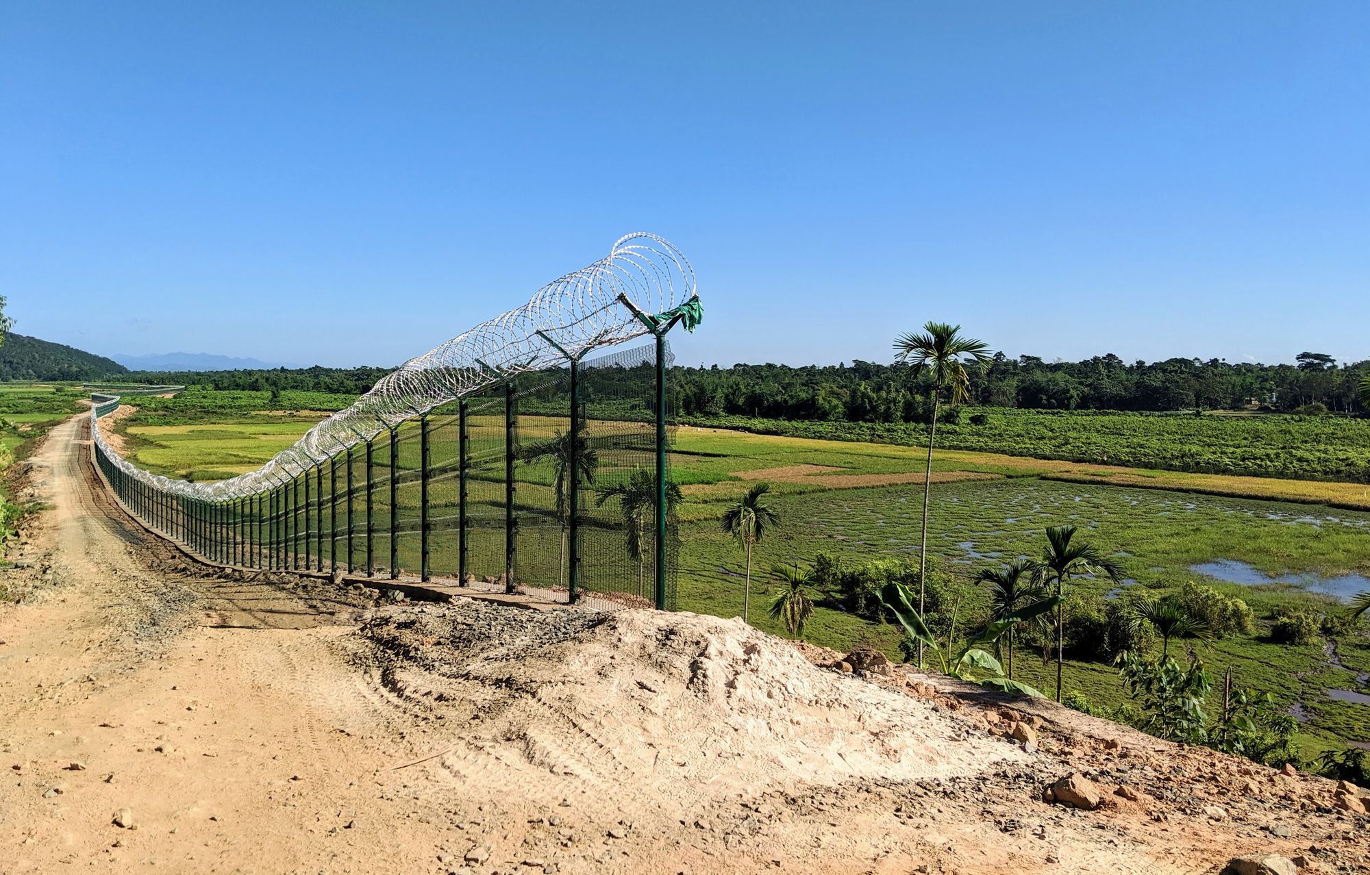 Unprotected India-Bangladesh border. Flat plains of Bangladesh begin at the foot of the mountains of Meghalaya
