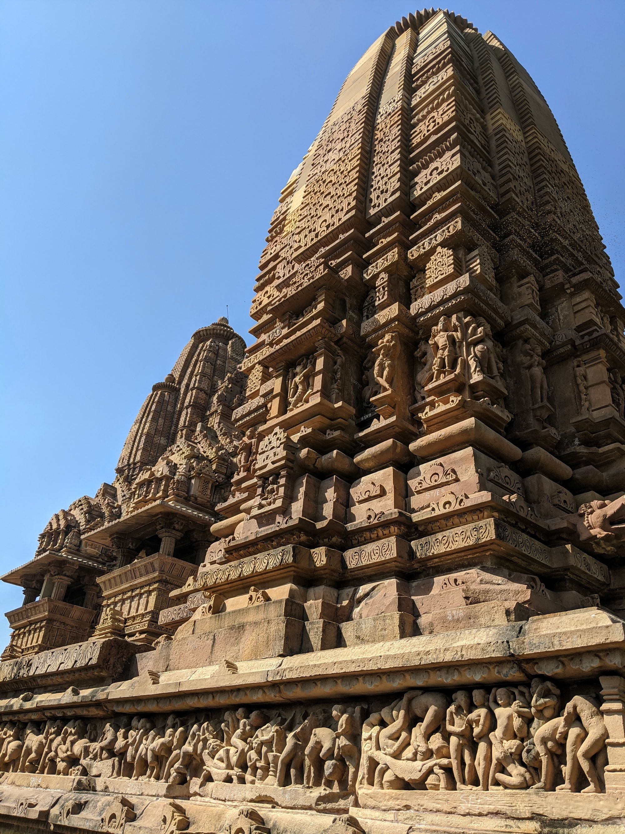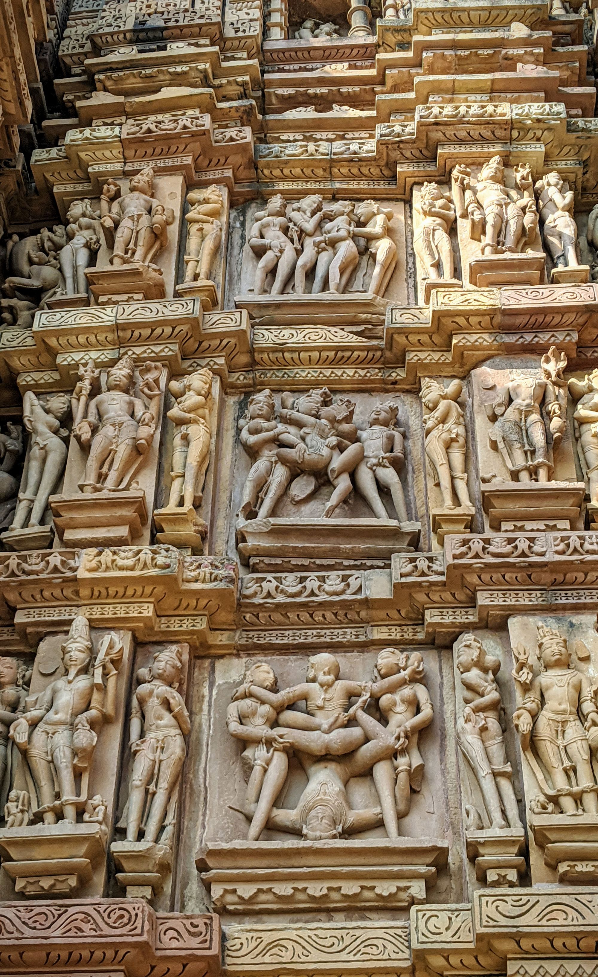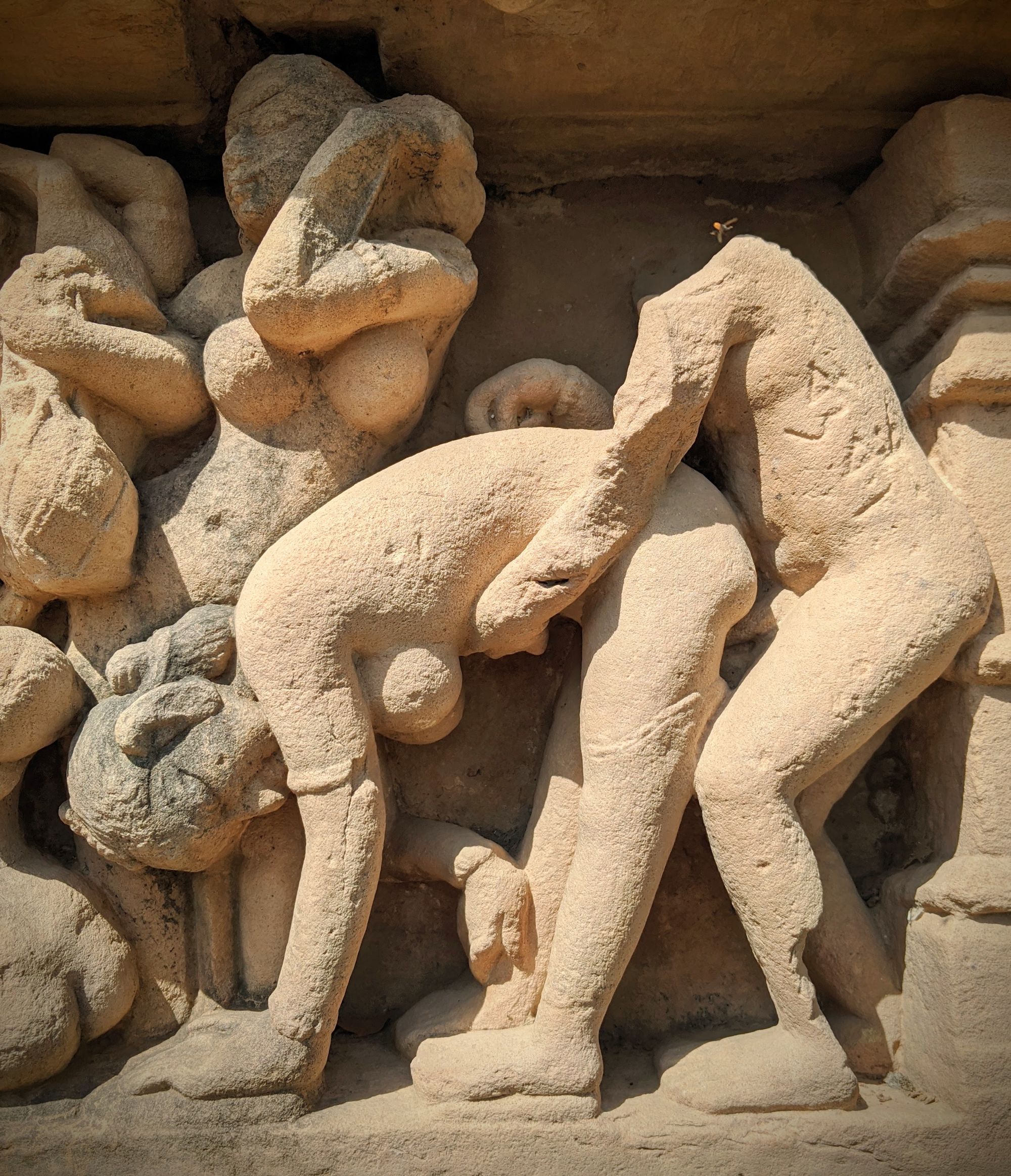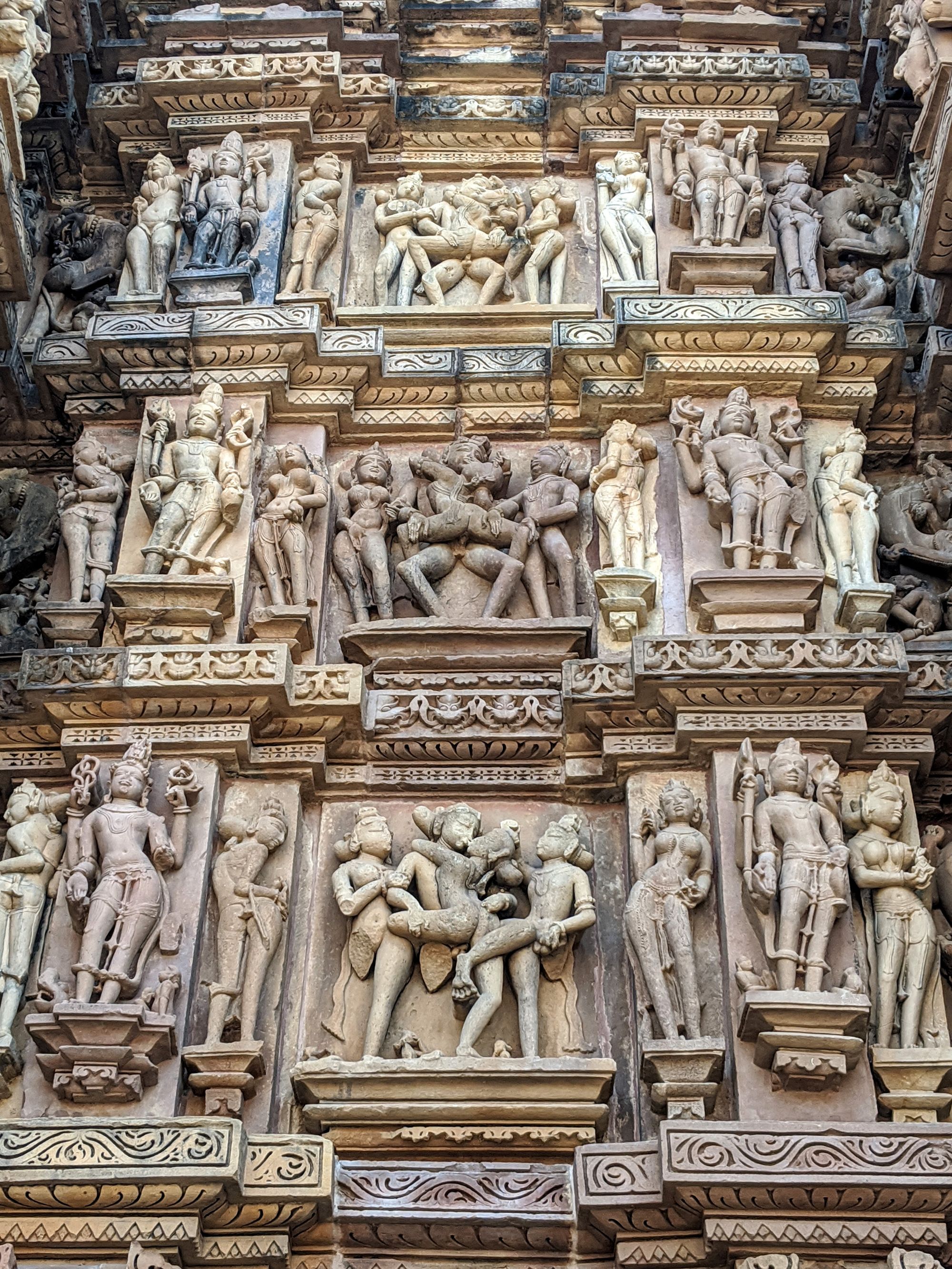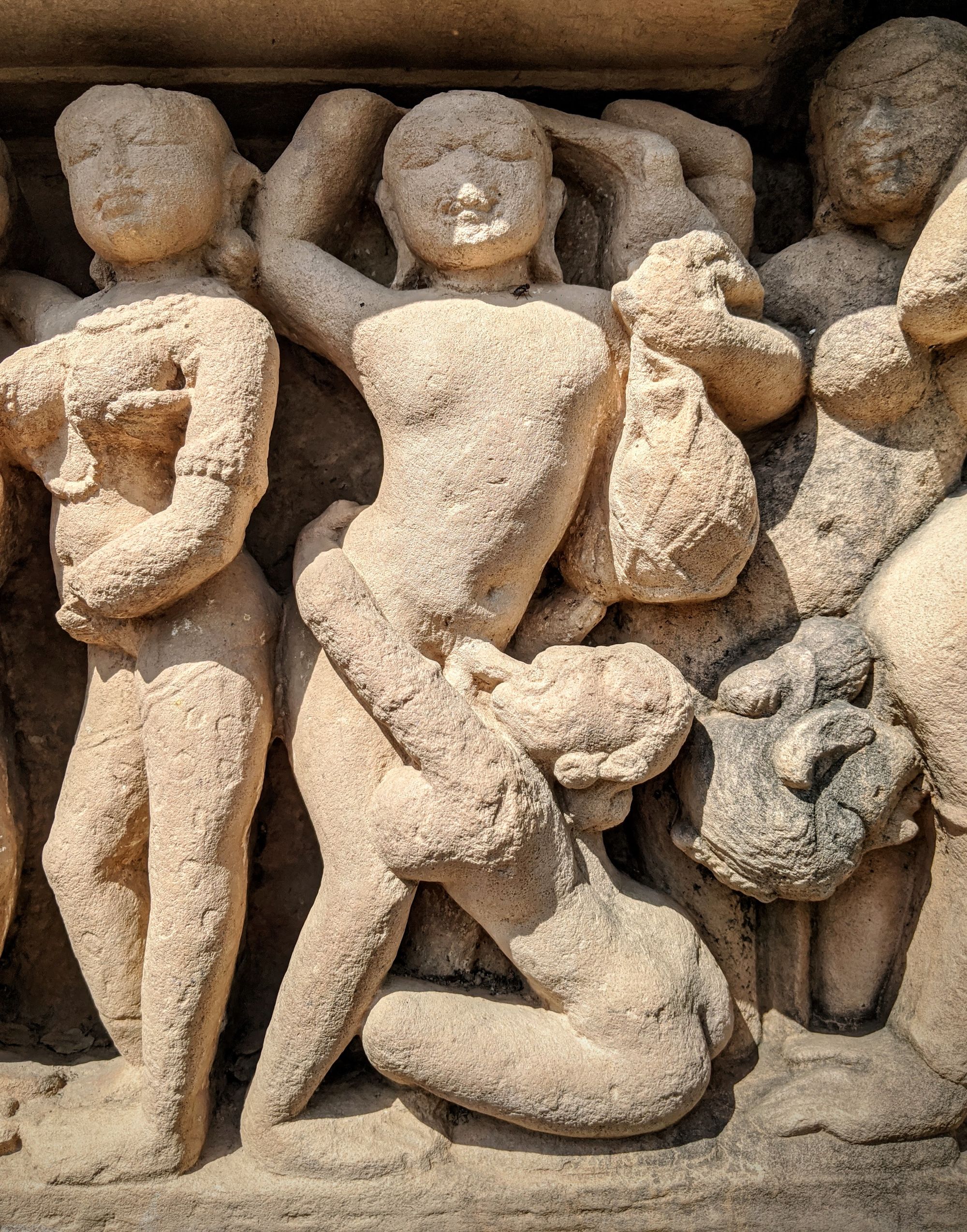 At the base of the very first temple, we are greeted with the famed sex sculptures. Even after reading about them, it is shocking how explicit they are. Go enjoy the photos and descriptions! It took me several minutes to even understand what’s going on in some complicated positions, and I’m still not sure how people can move and ‘do the deed’ in some other. The main temple of Shiva has the famous ‘headstand’ position on the southern side, though I’m pretty sure you’d break your neck if you try that at home.