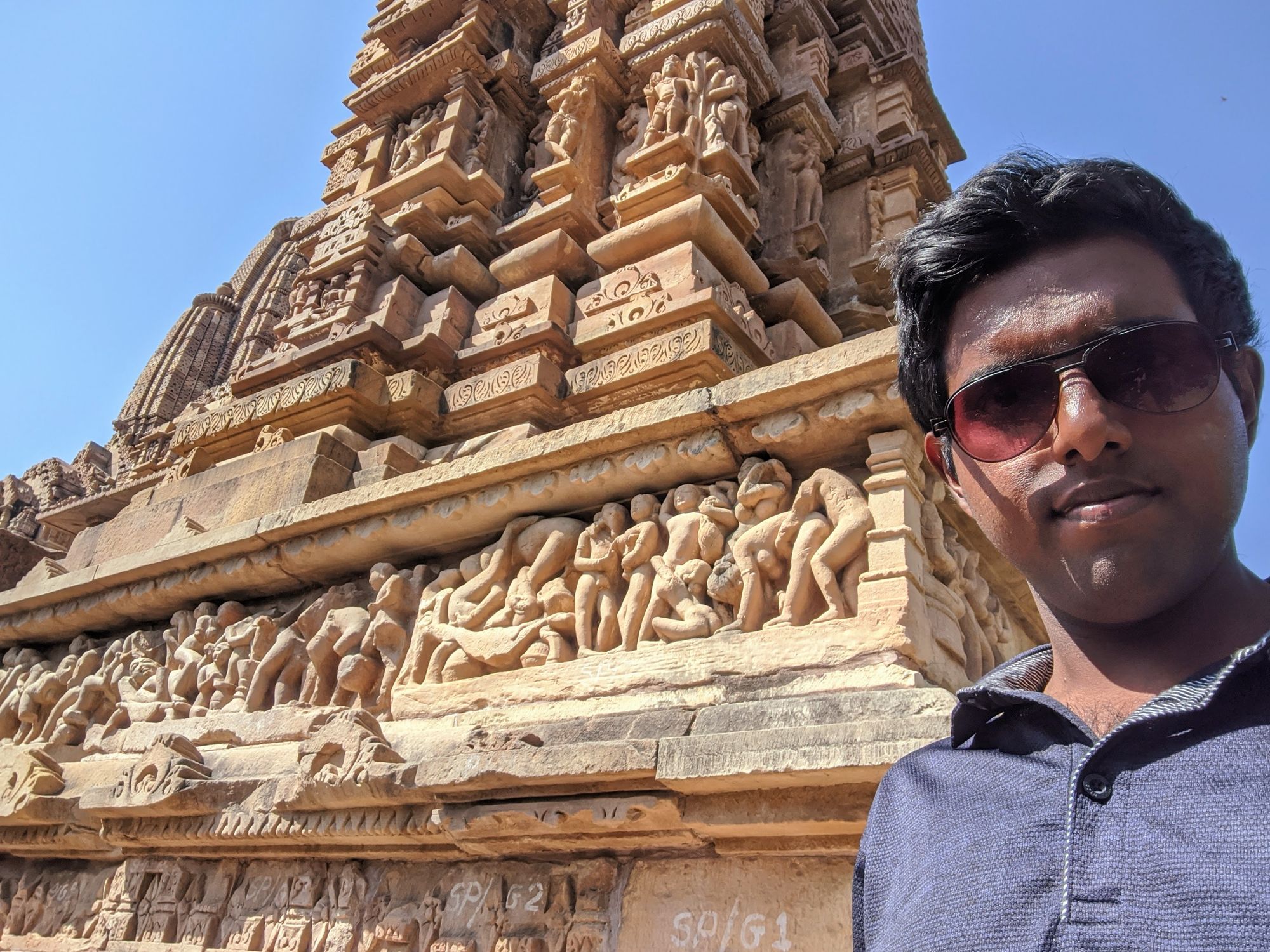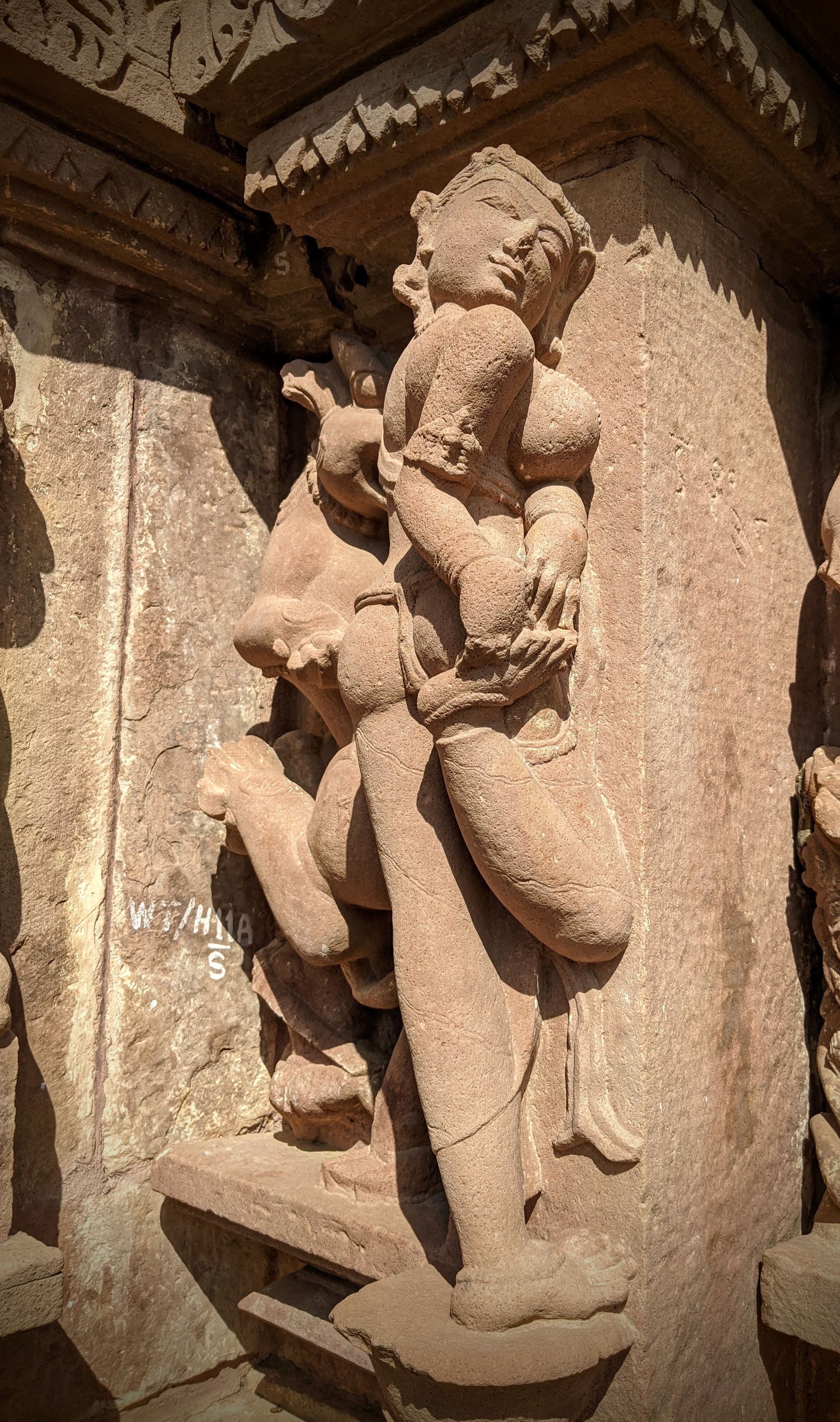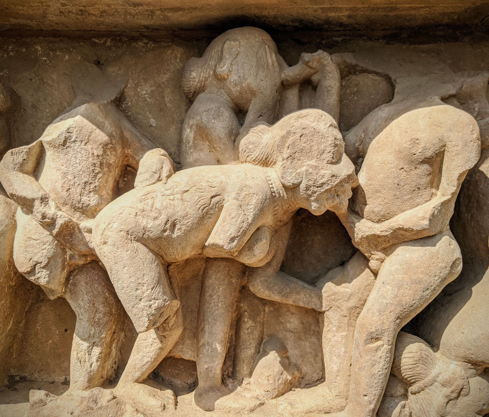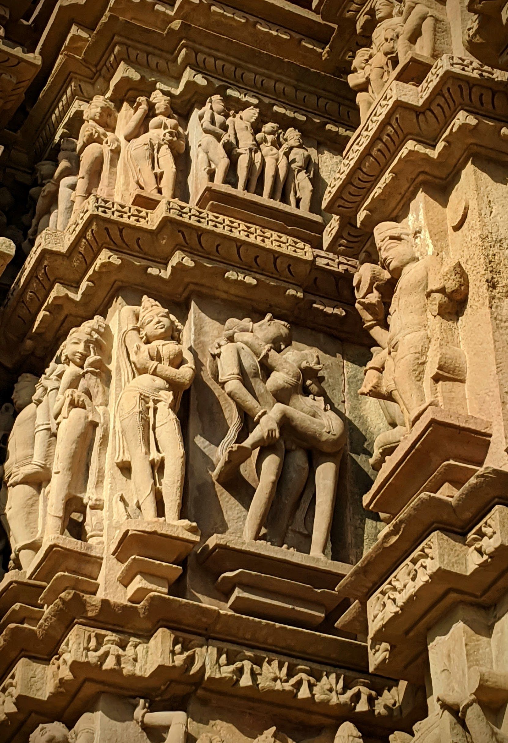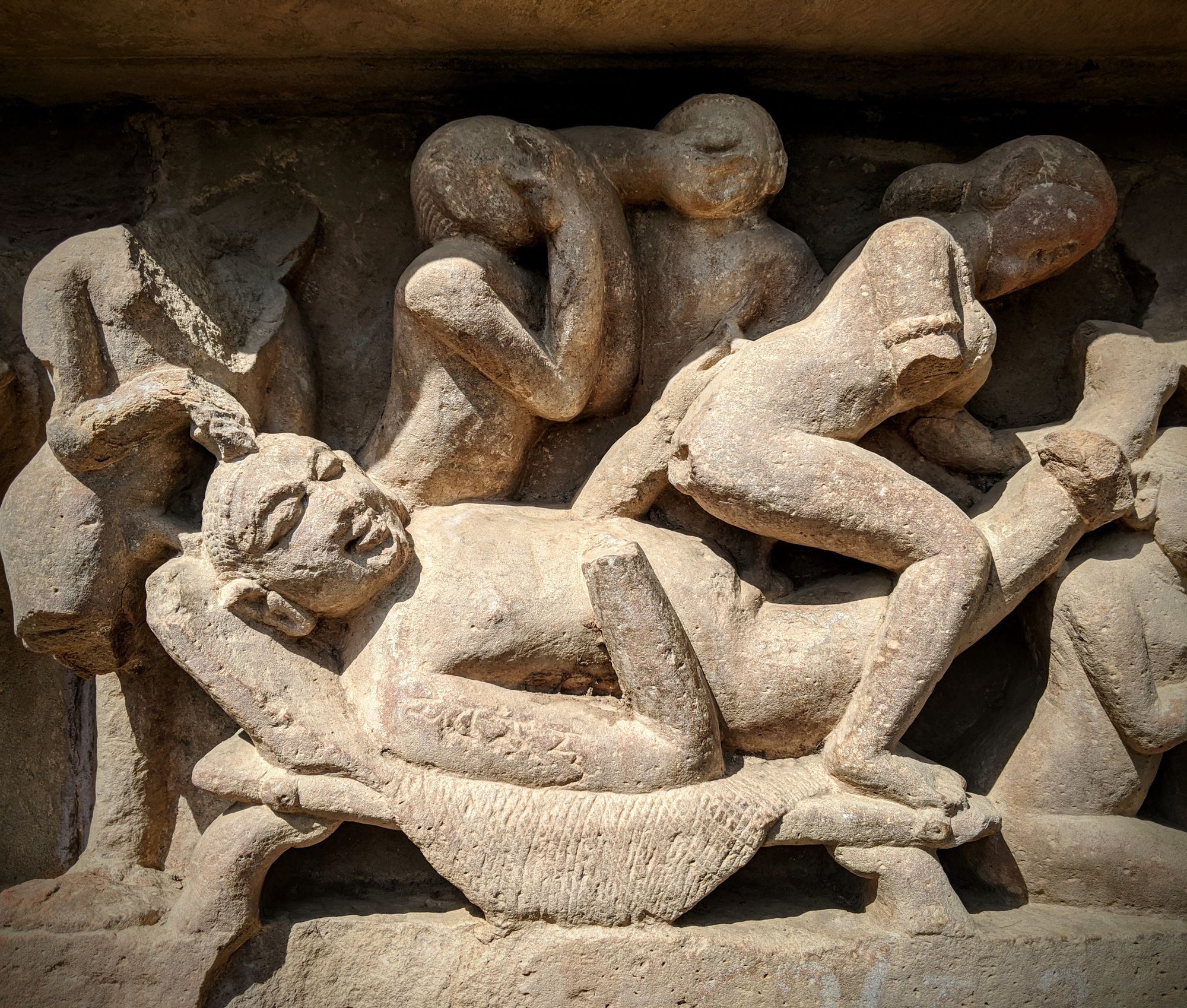 At the base of the very first temple, we are greeted with the famed sex sculptures. Even after reading about them, it is shocking how explicit they are. Go enjoy the photos and descriptions! It took me several minutes to even understand what’s going on in some complicated positions, and I’m still not sure how people can move and ‘do the deed’ in some other. The main temple of Shiva has the famous ‘headstand’ position on the southern side, though I’m pretty sure you’d break your neck if you try that at home.