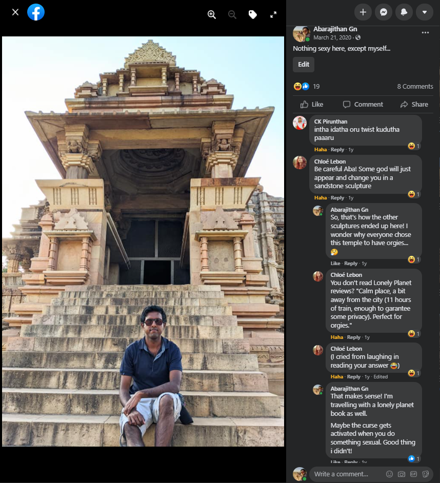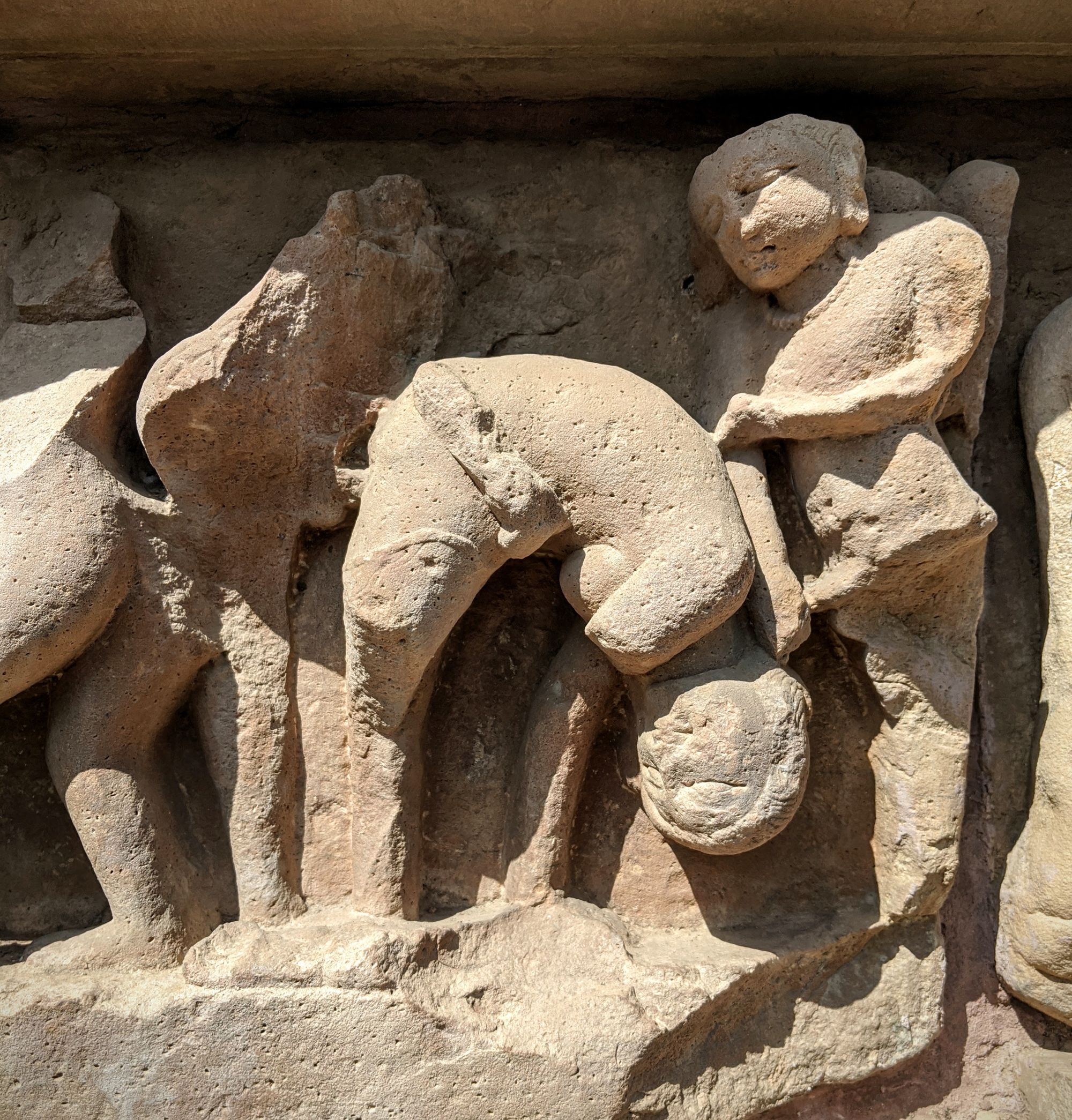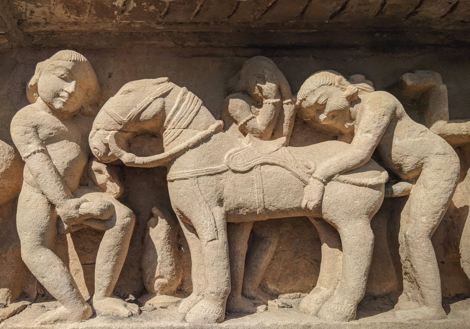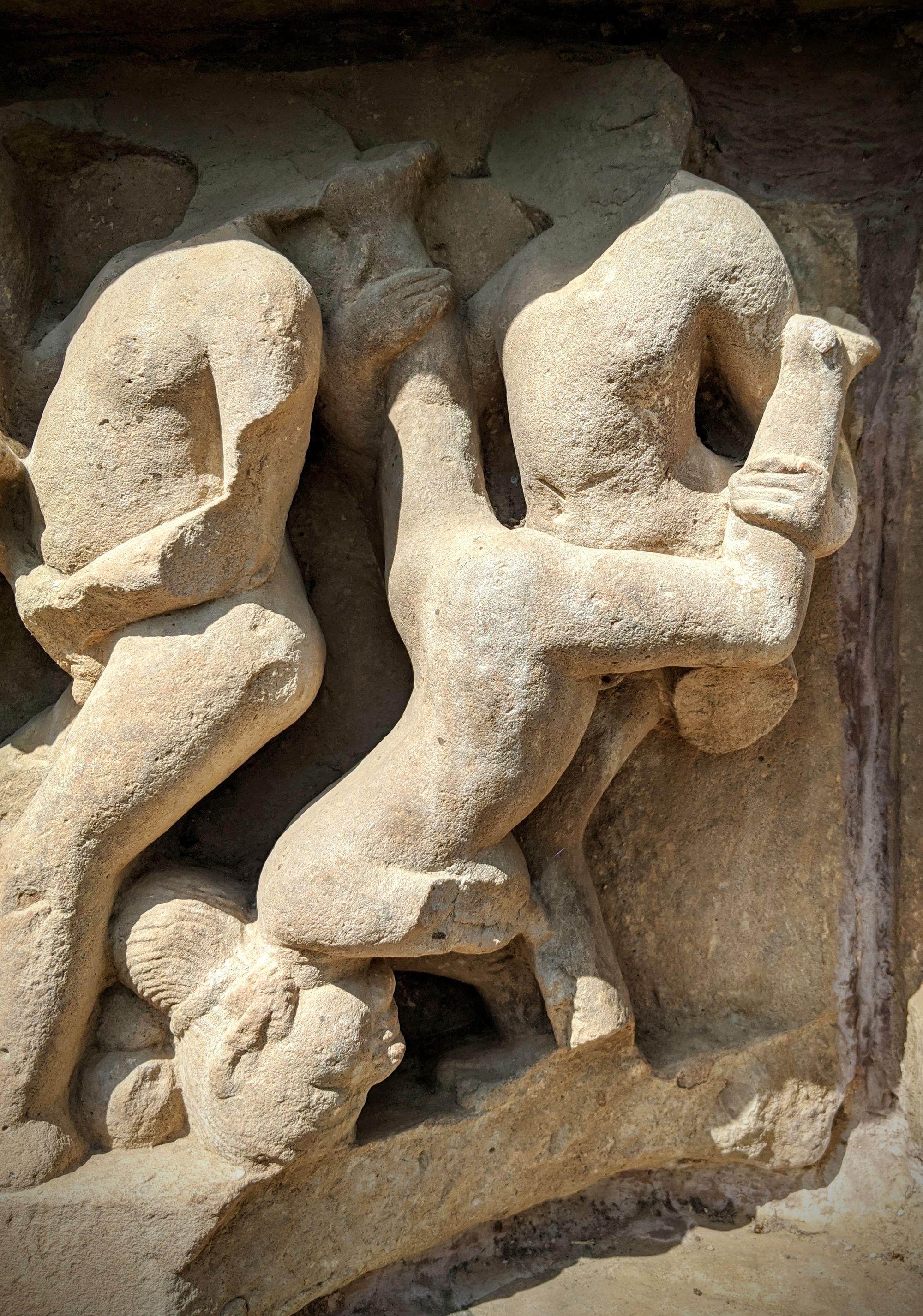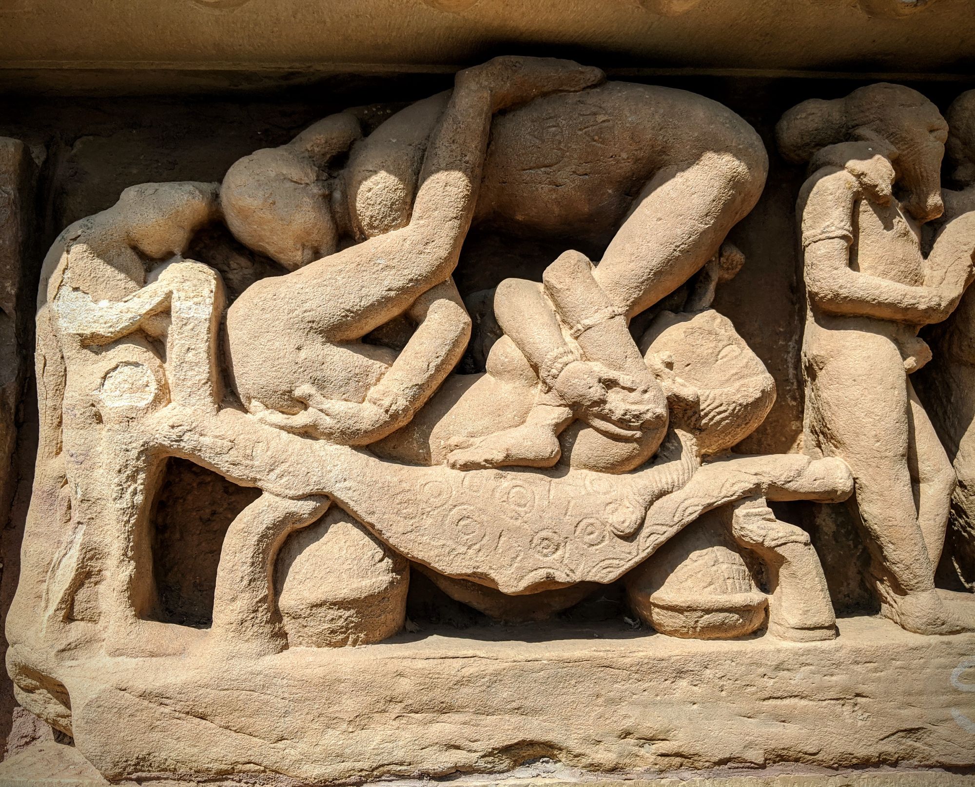 At the base of the very first temple, we are greeted with the famed sex sculptures. Even after reading about them, it is shocking how explicit they are. Go enjoy the photos and descriptions! It took me several minutes to even understand what’s going on in some complicated positions, and I’m still not sure how people can move and ‘do the deed’ in some other. The main temple of Shiva has the famous ‘headstand’ position on the southern side, though I’m pretty sure you’d break your neck if you try that at home.