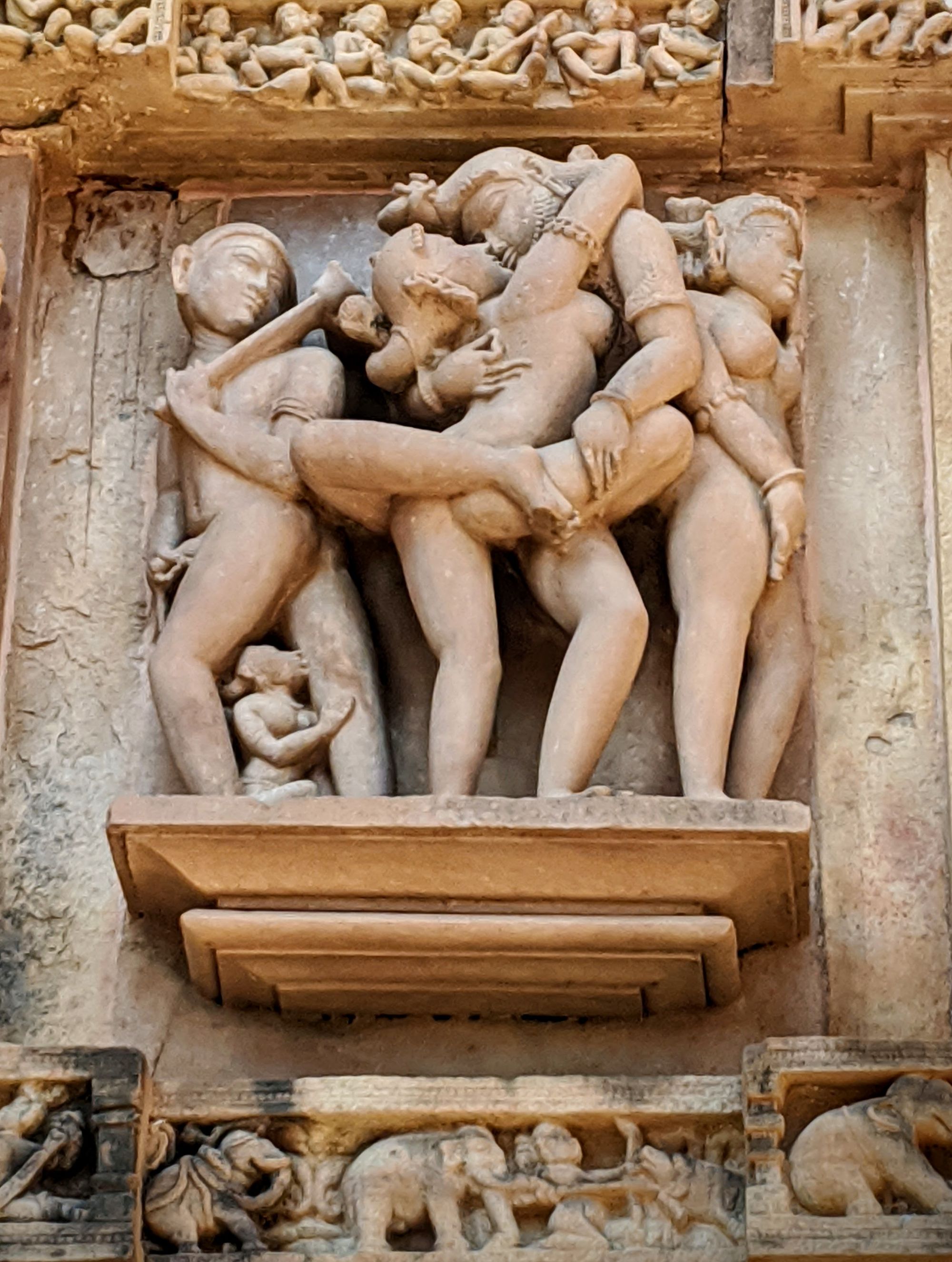 Of all sculptures, only 10% are sexual (clickbait title, gotcha!). In general, the sculptures depict the daily life of people 1000 years ago: music bands marching, elephants, camels and infantry at war, wrestling, progressions of kings and nobles, and so on. I’m really impressed to find ancient Indians were this kinky in daily life (looks like nobody did missionary those days!). I was also impressed to see women taking the lead and enjoying the action as much as, or even more than the men.